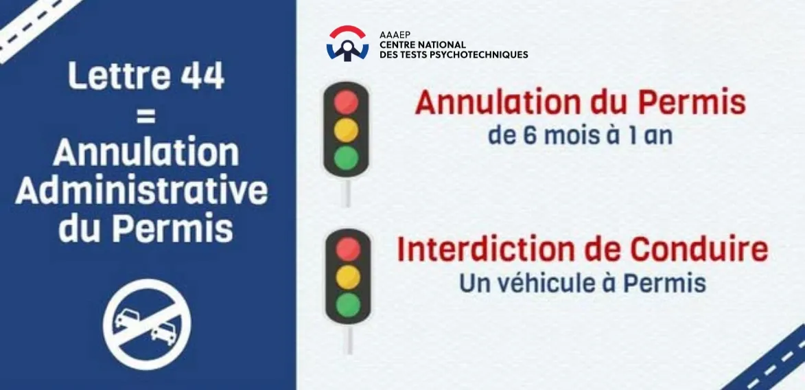 La lettre 44, ou avis d’annulation administrative, est un courrier officiel remis en mains propres au conducteur par la préfecture ou la sous-préfecture dont il dépend au moment de la restitution du permis annulé. Ce document contient les informations suivantes :