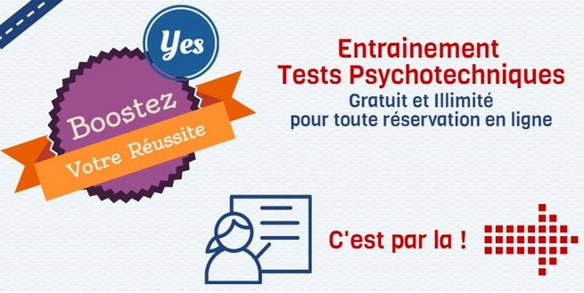 Afin de réduire le stress lié au passage du test psychotechnique et de vous permettre de découvrir les exercices réalisés au cours de l'examen, nous mettons à votre disposition un module d'entraînement complet. Suite à la réservation de votre test, vous recevrez par mail votre code de réservation qui vous permettra de bénéficier d'un entraînement au test psychotechnique gratuit et illimité.